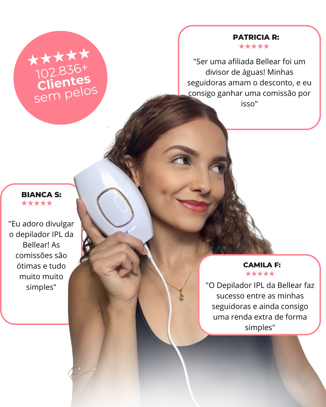 Junte-se à comunidade Bellear e conquiste sua liberdade financeira promovendo o melhor depilador IPL do Brasil. Ofereça descontos exclusivos para suas seguidoras e ganhe comissões de 20% em cada venda!